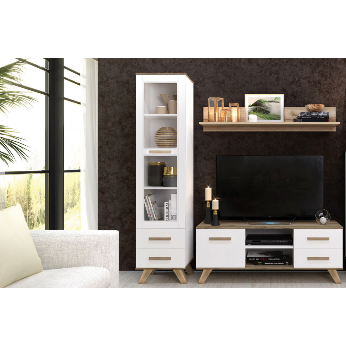 Комплект мебели в скандинавском стиле представлен в исполнении корпус – ЛДСП «Дуб каньон, белый», фасады – МДФ с покрытием глянцевой пленкой ПВХ белого цвета. В наборе витрина с прозрачным стеклом ,навесная полка для размещения посуды, сувениров и других предметов, тумба для телевизора широкая (1350 мм), низкий шкаф для закрытого хранения вещей личные вещи.