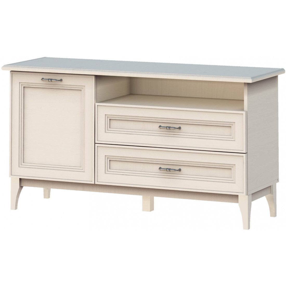 -два отделения, разделённые перегородкой: два ящика и открытая ниша над ними, отделение с распашным фасадом с полкой ЛДСП за ним.